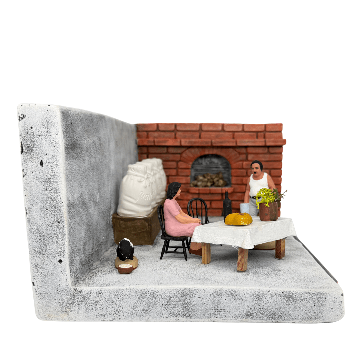 Cette scène comprend : un décor de boulangerie, 4 sacs de farine, un pétrin et la pelle, Aimable, Aurélie, Pomponette et son bol de lait, un pain en cœur, une bouteille de vin, un verre, un pot de fleur, une table et deux chaises.